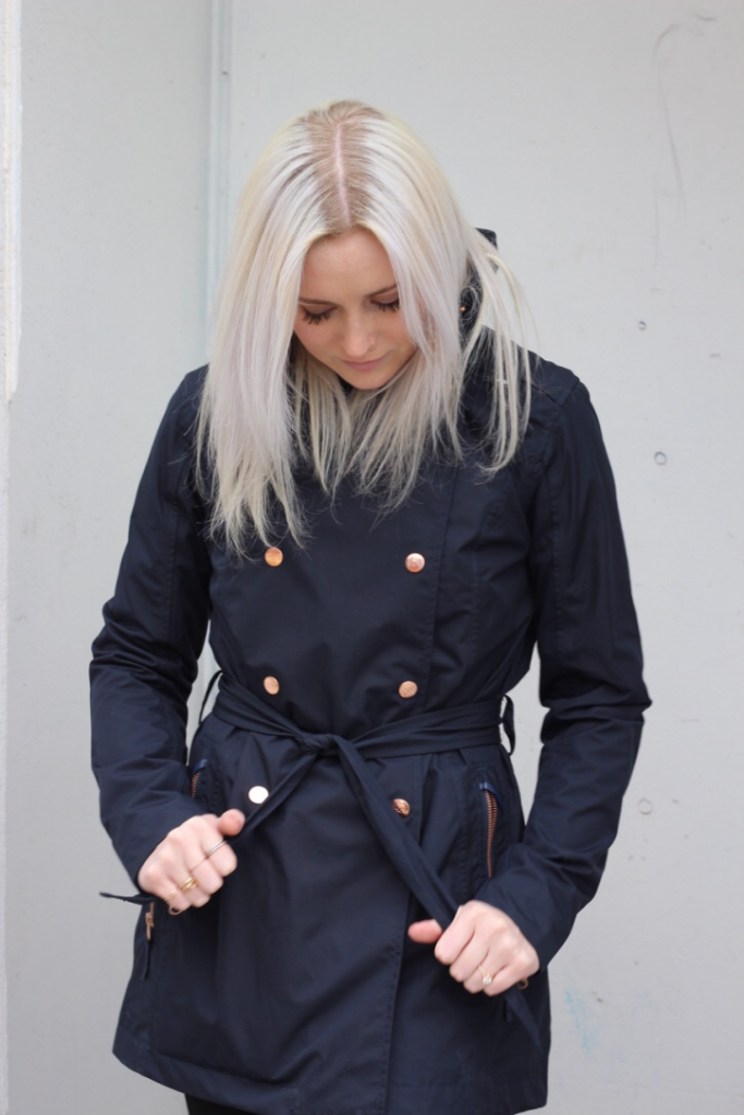 This look is a more classic and practical combination but there’s a twist. Rose. Gold. Hardware. And now it just went up ten points on the fashion scale. What I love so much about this jacket is I can easily wear it with jeans and a t-shirt while I’m out and about but I could also sport this for a dressier event. The rose gold immediately spices it up in all the right ways and I can control the shape of the silhouette with the waist tie. It is also navy blue so it’s not obnoxious but it’s also not the same black jacket that everyone else has. No offence.